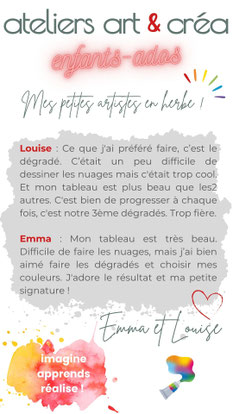 Le calendrier sera communiqué au fil de l’eau avec les thèmes proposés et / ou choisis par les enfants, sur les réseaux et sur mon site ici. L’occasion d’essayer différents supports et de jouer avec les couleurs ! Inscriptions en cours. Places limitées à 4 enfants par atelier.