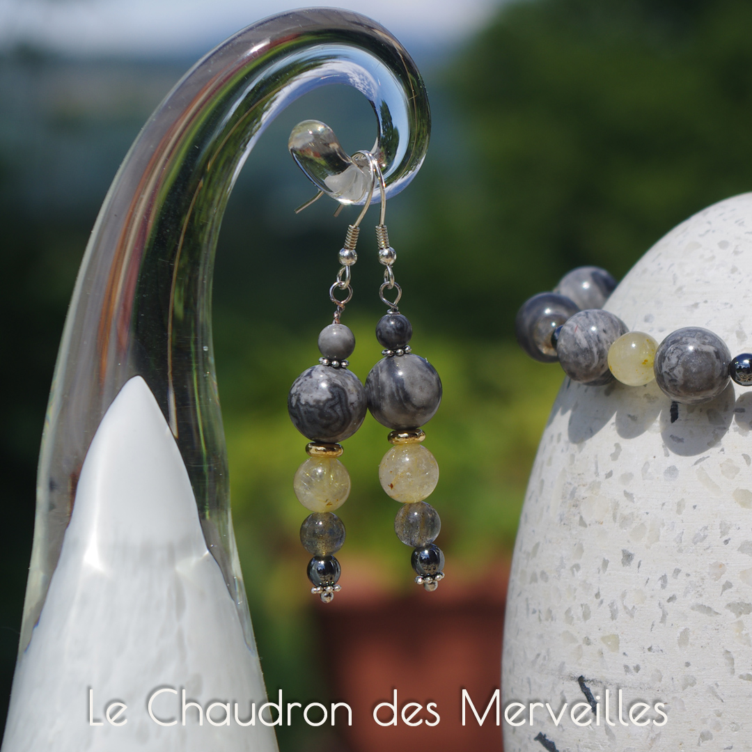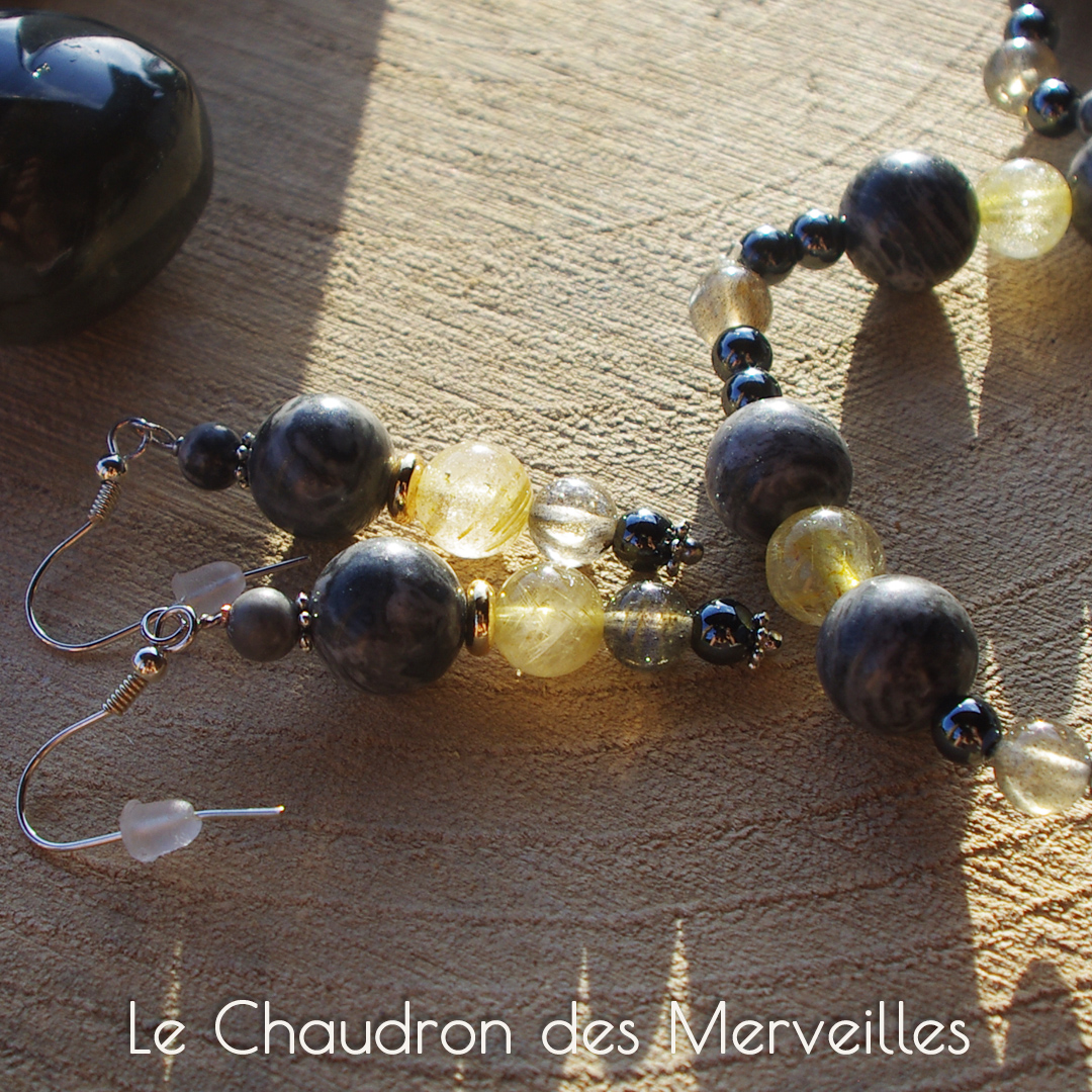 Les cristaux et éléments qui se sont invités pour magnifier et soutenir les clés de bonheur : Jaspe feuille d’argent – Quartz rutile – Hématite – Labradorite – rondelle plaqué or pour le Grigri Joli et les boucles d’oreilles.