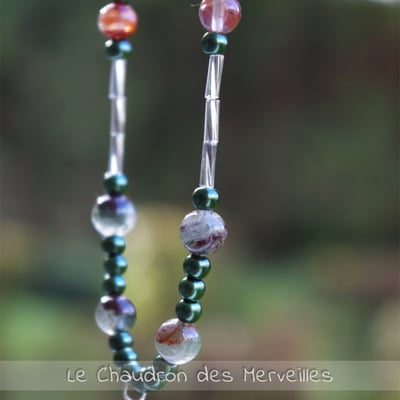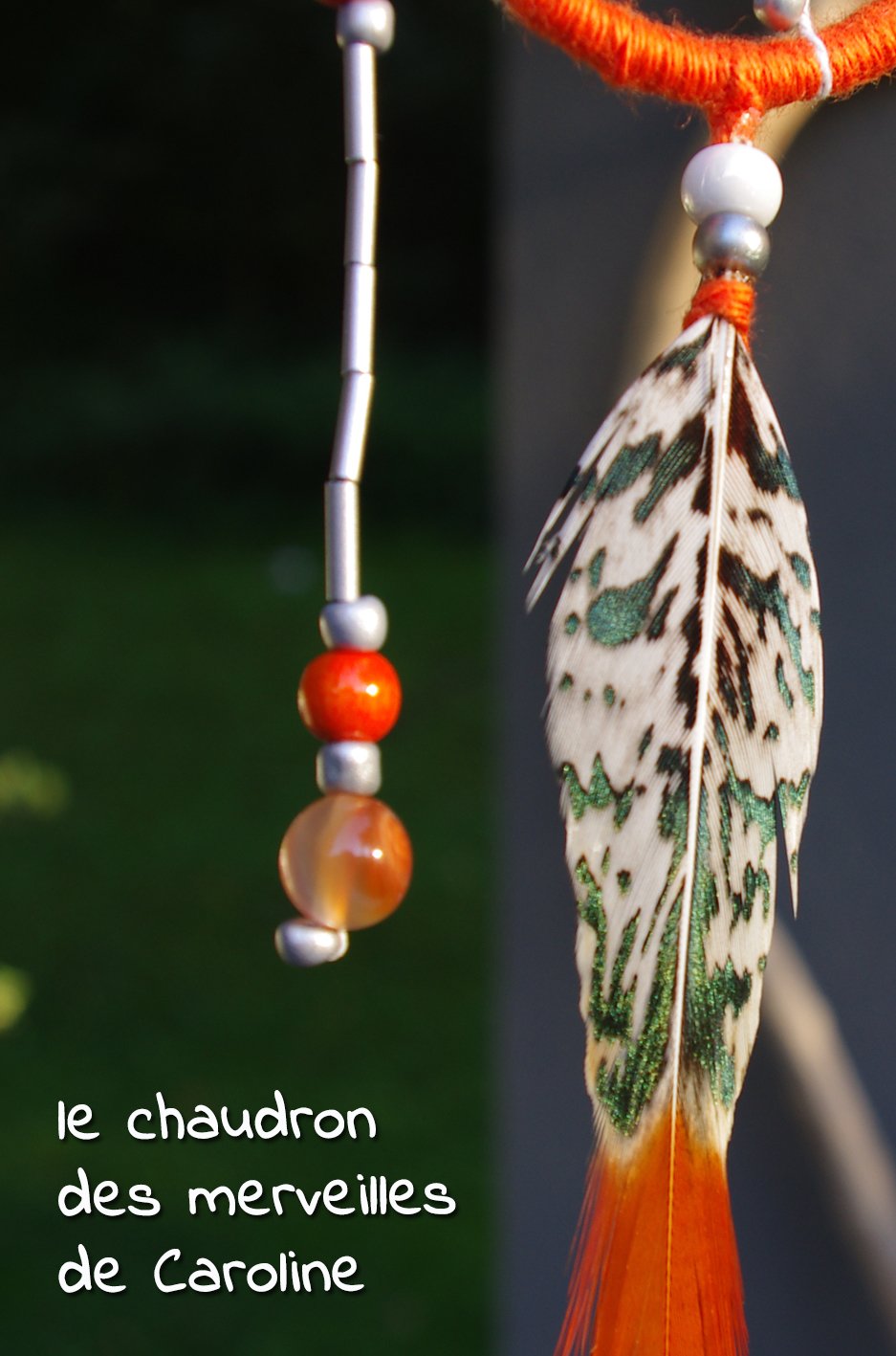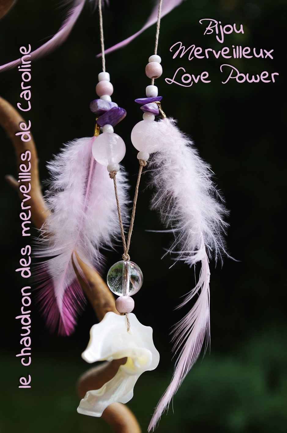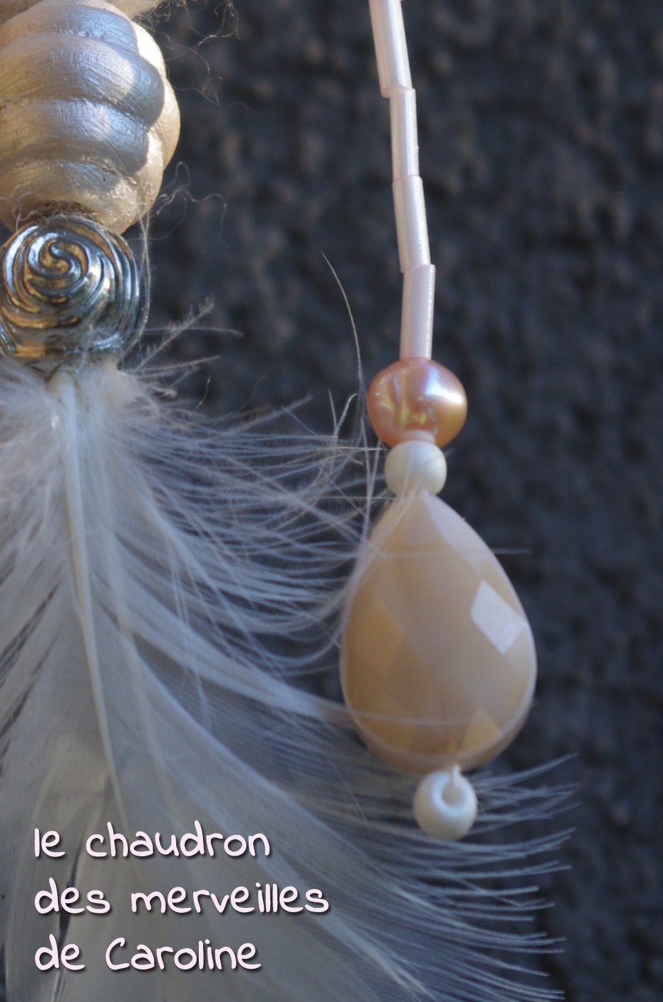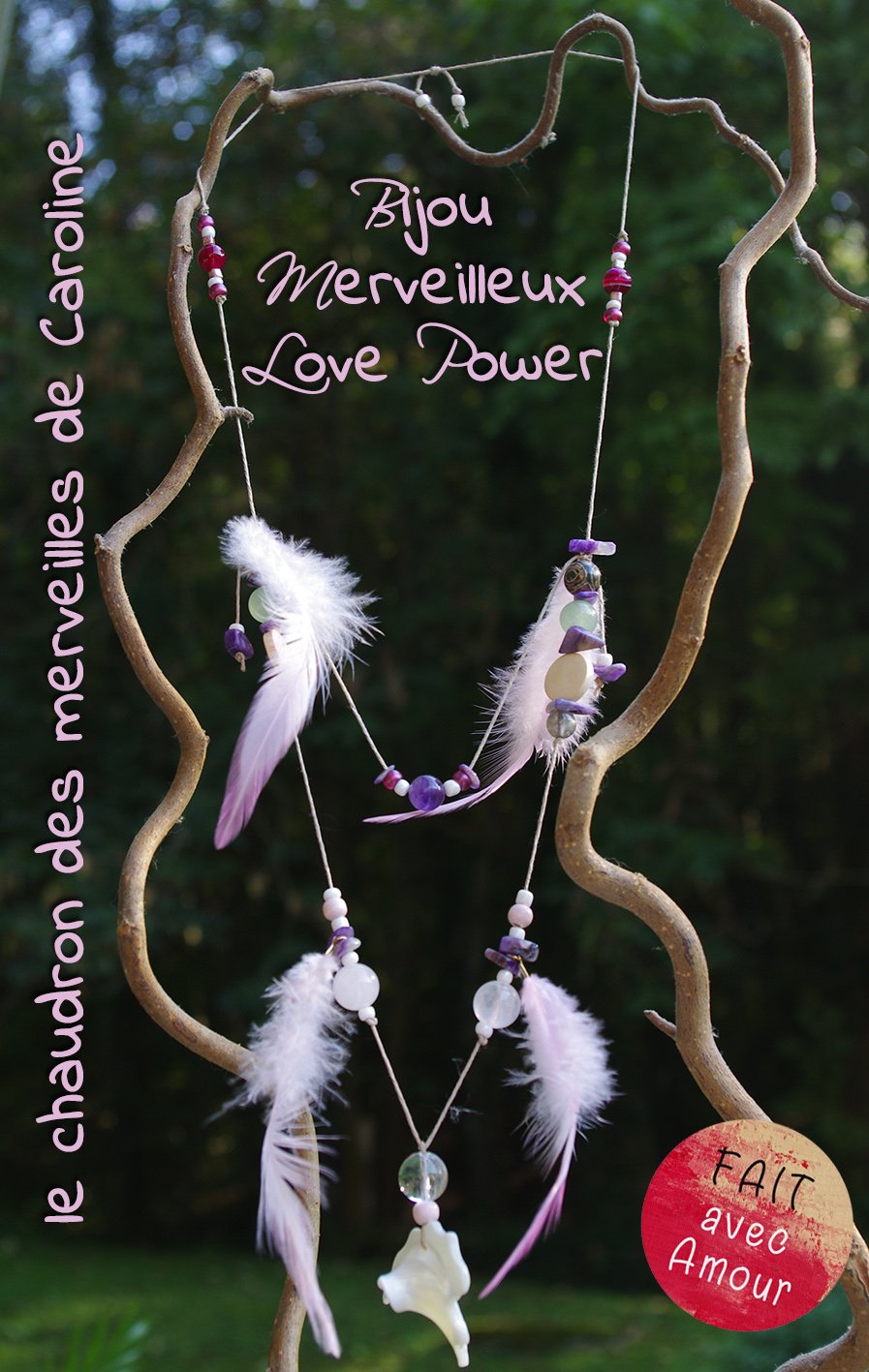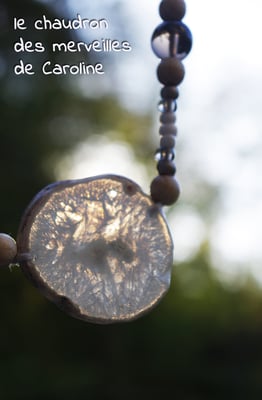 J'utilise là aussi des trésors de perles amoureusement choisies, en pierres semi-précieuses (fines), lave, nacre naturelle, coquillage, os, céramique, pâte de verre, bois, des plumes naturelles, si possible ramassées, des matériaux naturels, corde, lin, coton, laine, chanvre, cuir... Et je mets une intention d'amour en les réalisant.