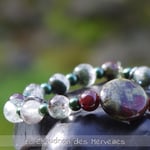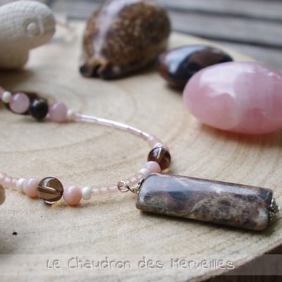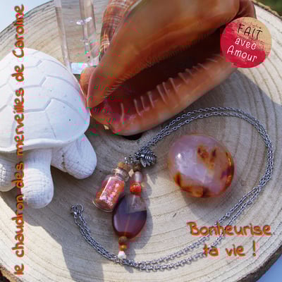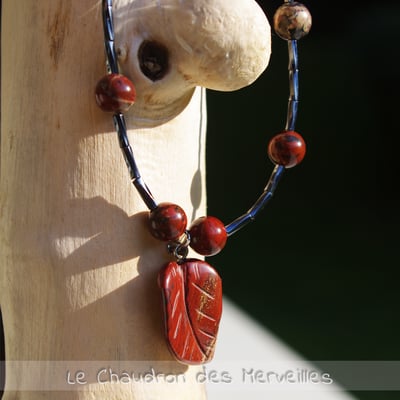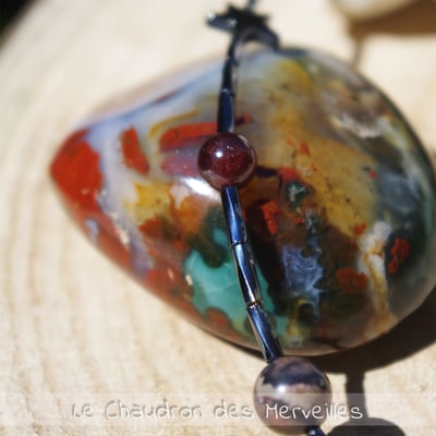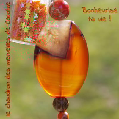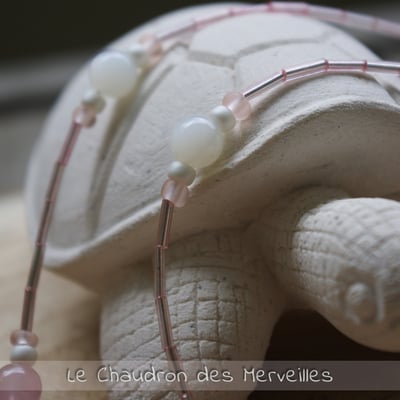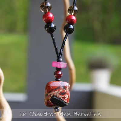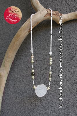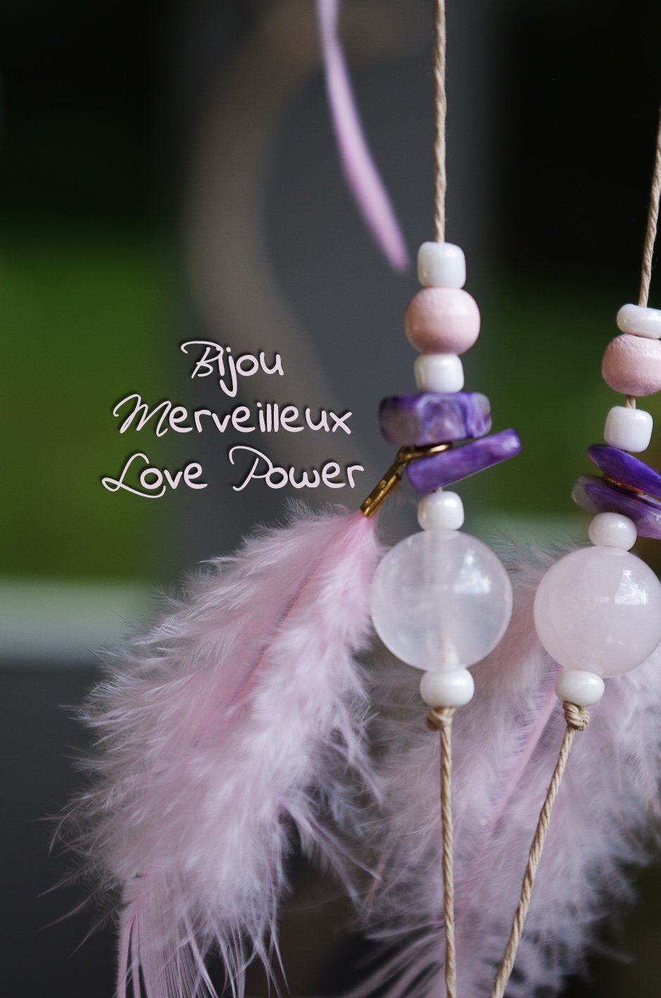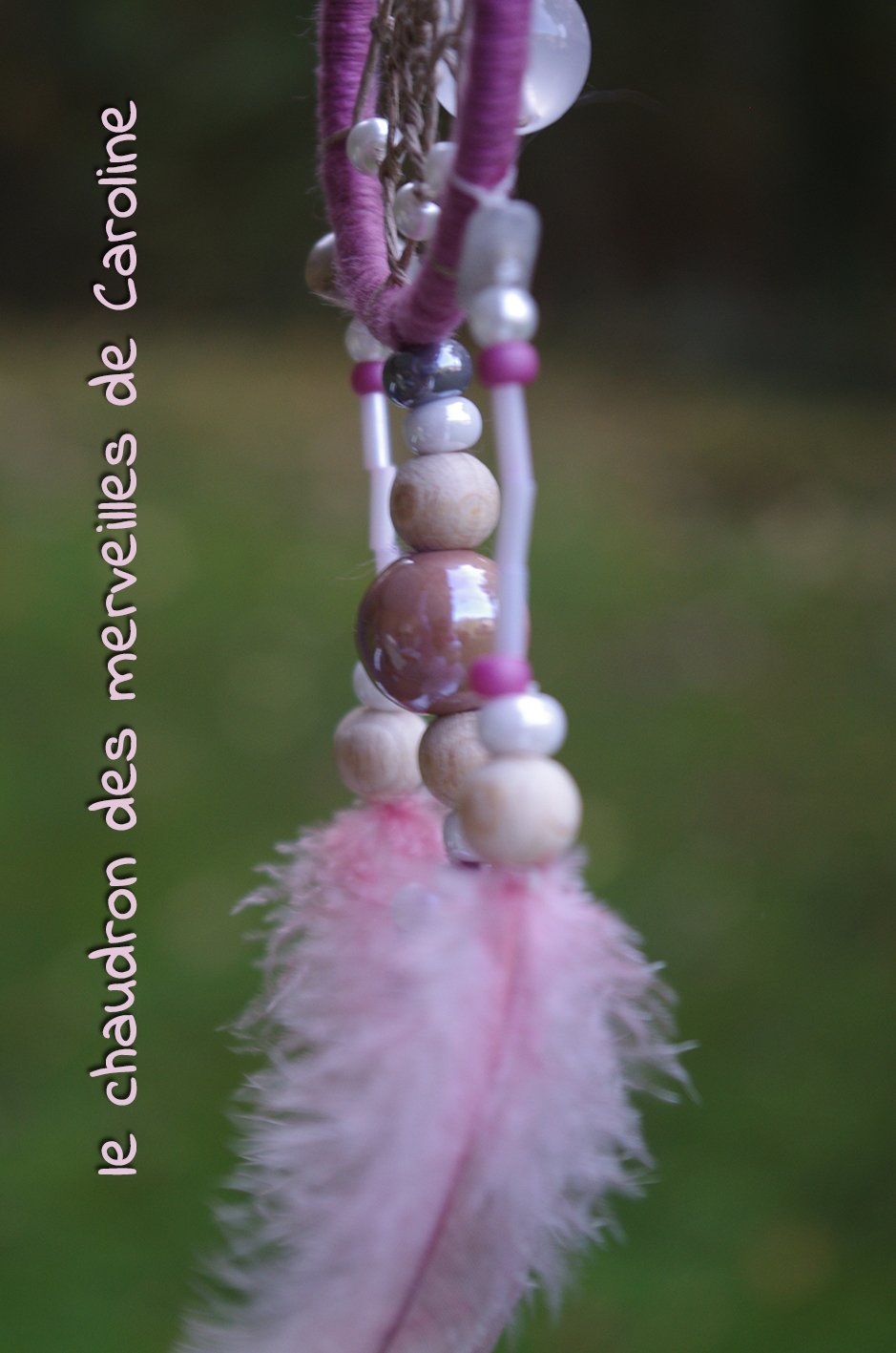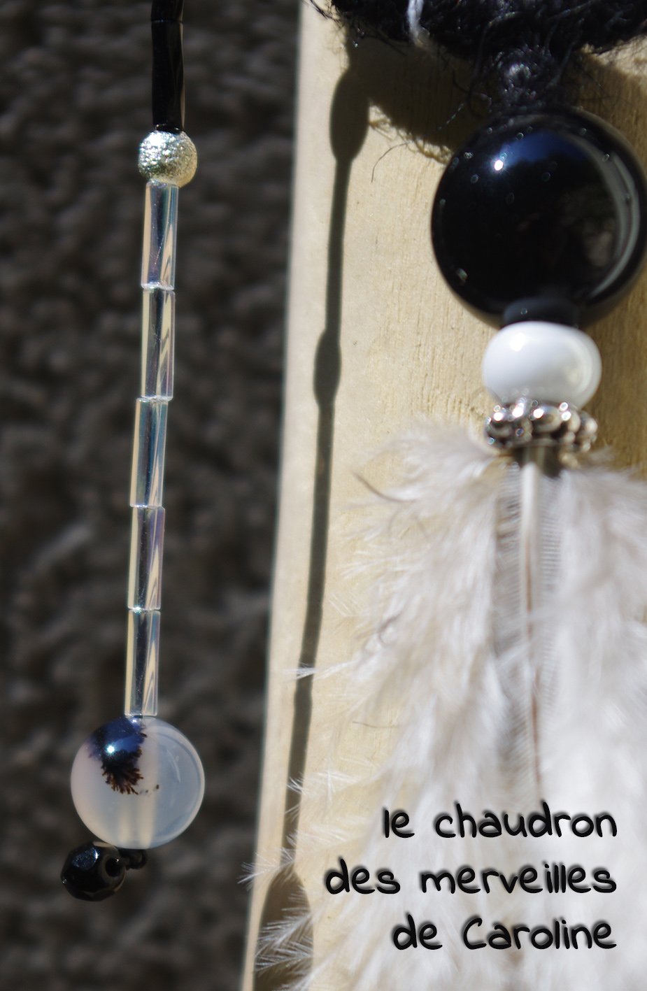 J'utilise là aussi des trésors de perles amoureusement choisies, en pierres semi-précieuses (fines), lave, nacre naturelle, coquillage, os, céramique, pâte de verre, bois, des plumes naturelles, si possible ramassées, des matériaux naturels, corde, lin, coton, laine, chanvre, cuir... Et je mets une intention d'amour en les réalisant.